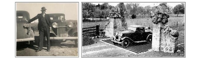 The photos above are two rare examples of 1932 Fords that happen to be in photographs taken at the time here in New Zealand. On the left, a gentleman leans against a late 30's Chevrolet while we all drool over the other car that happens to be in the photo! On the right, a press photo of the new stone gates in Auckland's Cornwall Park, taken just as a 1932 Ford V8 roadster happens to be driving through and over the cattle stop.